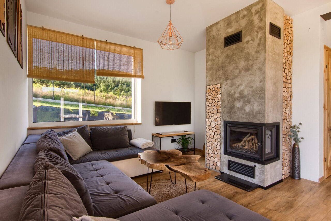 Salon (wypoczynek z funkcją spania, TV ( Netflix), kominek, wyjście do ogrodu.