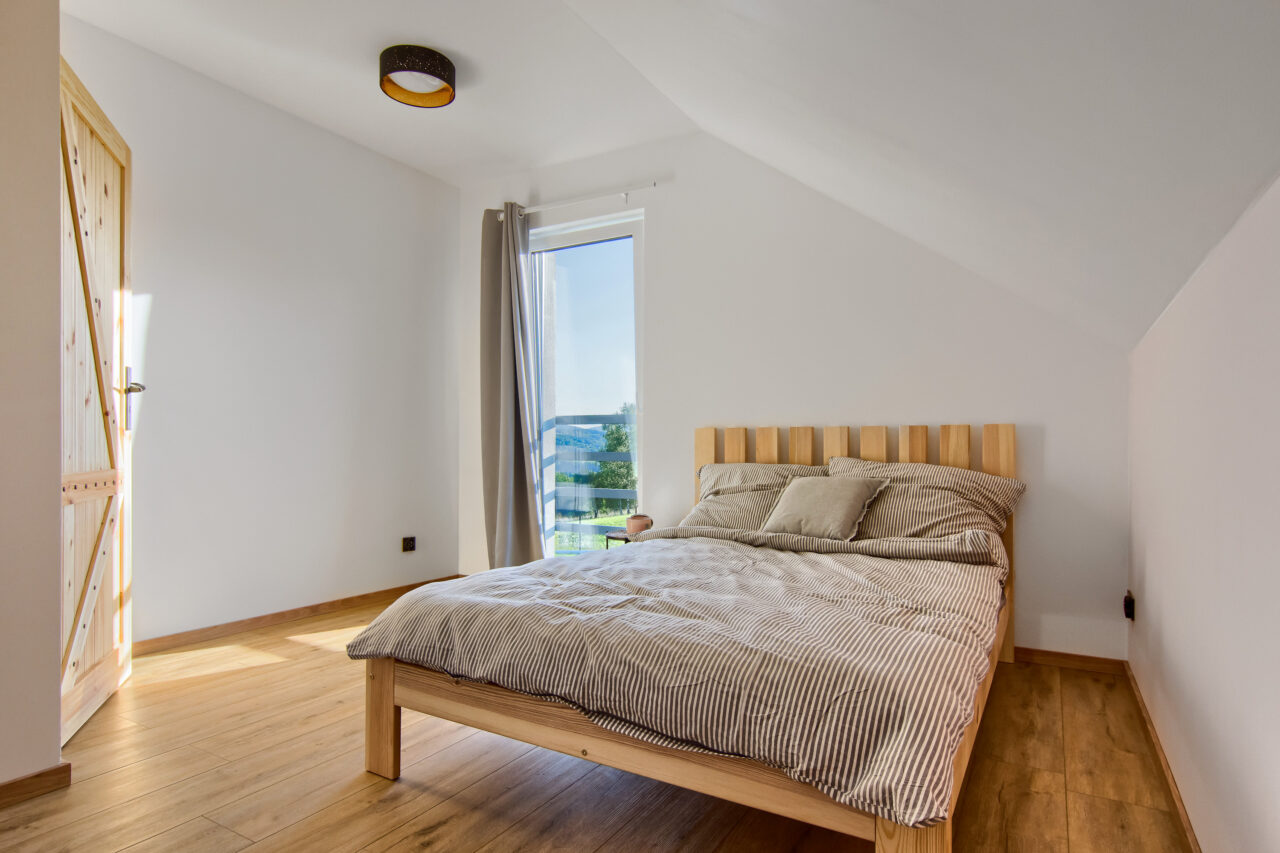 Na poddaszu znajdują się trzy sypialnie: Pierwsza sypialnia dla 4 osób ( 1 łóżko king size oraz 2 pojedyncze) druga sypialnia dla 2 osób ( 1 łóżko king size) trzecia sypialnia także 2 osobowa ( 2 pojedyncze łóżka ). Łazienka na poddaszu oprócz kabiny prysznicowej została wyposażona takze w wannę.